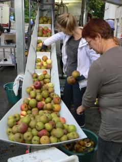 De mobiele fruitpers die vandaag aan de Rink in Sint-Pieters-Leeuw staat is een technologisch wondertje dat spoelt, raspt, perst en pasteuriseert.