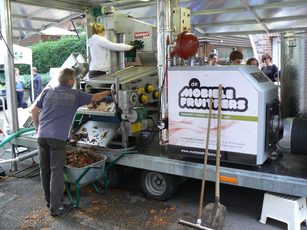 De mobiele fruitpers is een technologisch wondertje dat spoelt, raspt, perst en pasteuriseert. Het gezonde sap wordt afgevuld op vacuüm vaatjes van 5 liter die tot twee jaar ongekoeld bewaren.